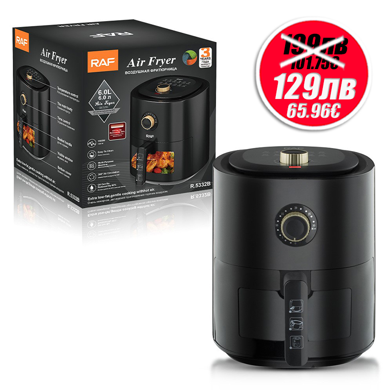 Въздушен фритюрник RAF 5332 – 6L вместимост, 1500W мощност, здравословно готвене без олио, лесно почистване и хрупкави резултати за семейството.
