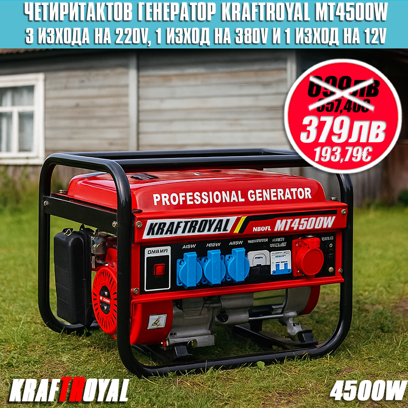 Бензинов генератор 4.5 kW с AVR стабилизатор, нисък шум и икономичен разход – идеален за дома, вилата и работния обект. Надежден агрегат за ток при аварии.