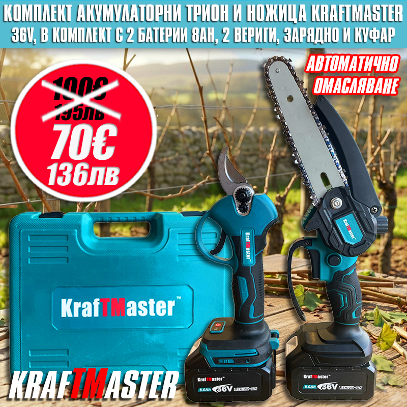 абравете за умората в ръцете и досадните кабели. Акумулаторният комплект KraftMaster е създаден за градинари, които ценят времето си и търсят професионални резултати с минимални усилия. Независимо дали подрязвате лозето или оформяте короните на дърветата, това дуо инструменти ще се превърне в новия ви любим помощник.