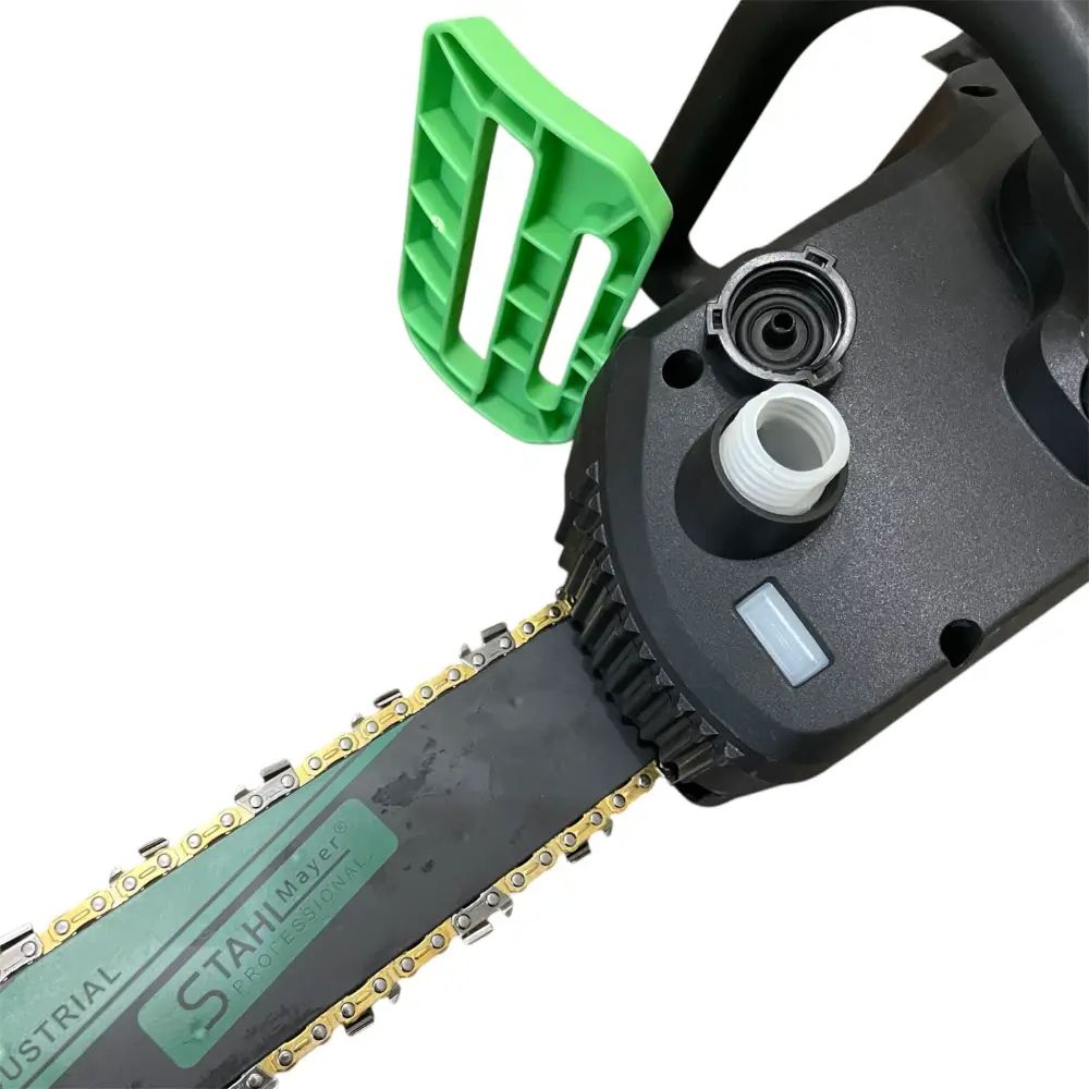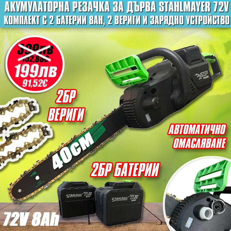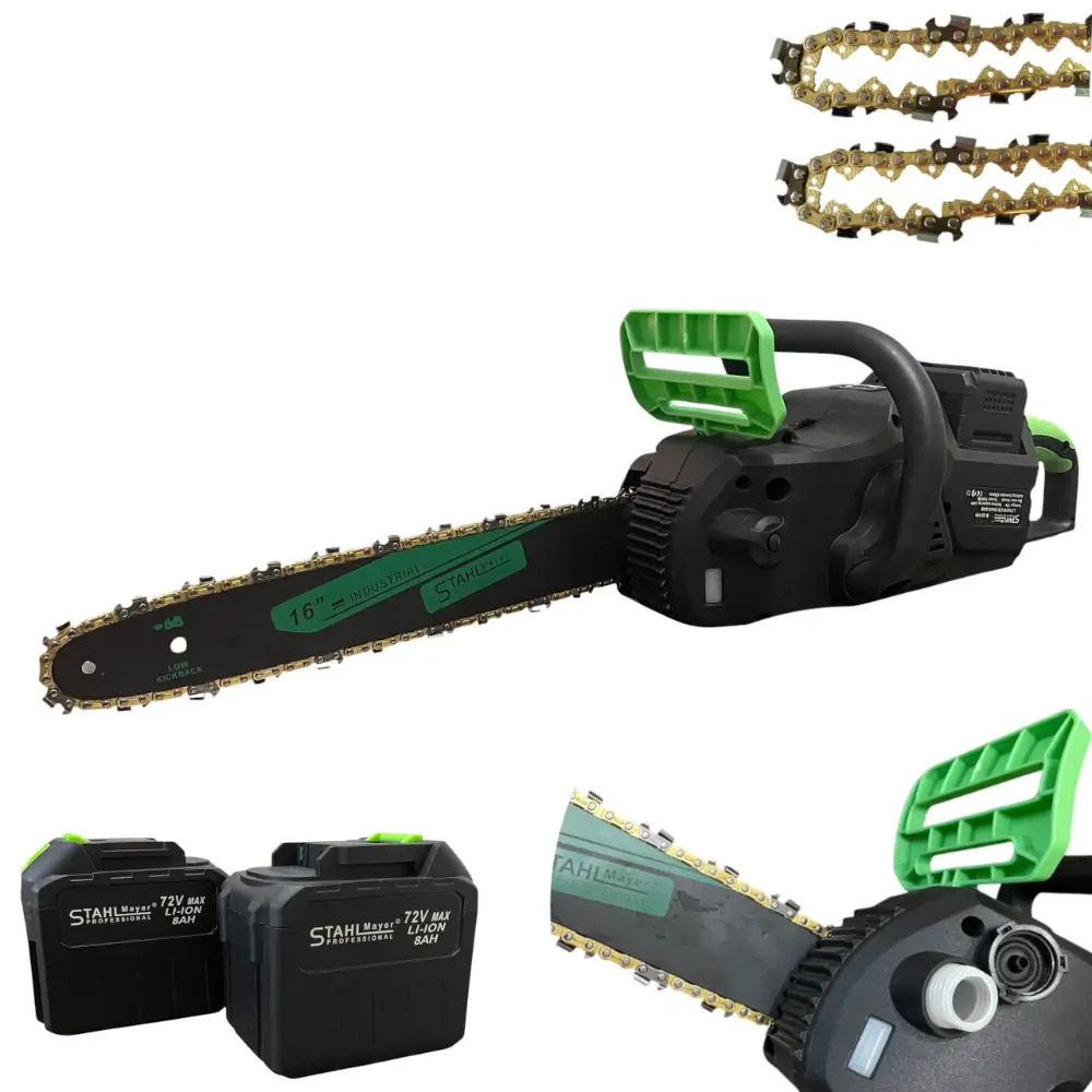 Открийте мощната акумулаторна резачка STAHLMAYER 72V 8Ah – безжична, професионална и готова за работа с 2 батерии, 16″ шина и автоматично смазване. Идеална за дърва, клони и градинска поддръжка.