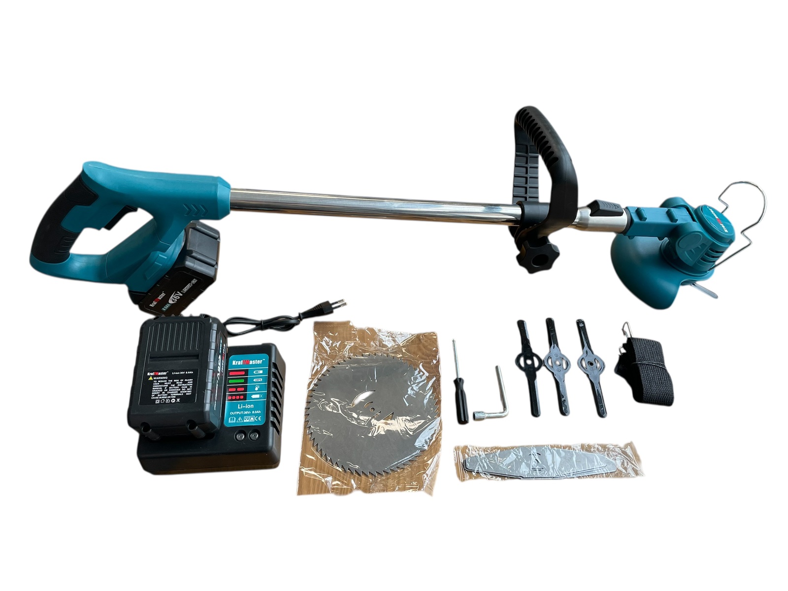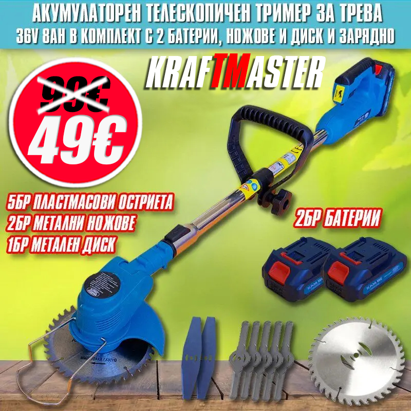 Акумулаторен тример за трева KraftMaster 36V 8Ah с 2 батерии и зарядно – мощен, лек и удобен
